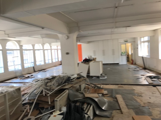 The original flooring was shambolic when we took over the work with the floorboards having been cut and lifted in places to facilitate the replacement of the original radiators and fitting of new floor mounted air conditioner units with heating facility. The floorboards where replaced, the original vinyl flooring was removed and oak engineered flooring was fitted throughout.